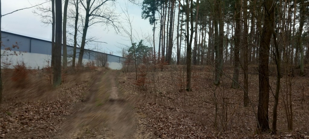 W każdym razie wspomnianym wałem wędrujemy dalej w kierunku wschodnim. Po prawej ręce mamy widok najpierw na dawne zakłady Polmo (obecnie Wasiak SA), dalej na nieczynny tartak oraz zakłady Mikobud, za którymi znajduje się stroma piaszczysta skarpa (niektórzy się tam opalają i kąpią). A po lewej głównie zarośla, jedynie na początku również są przemysłowe zabudowania należące do producenta trumien Cieczki.