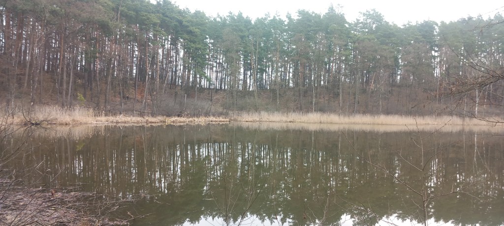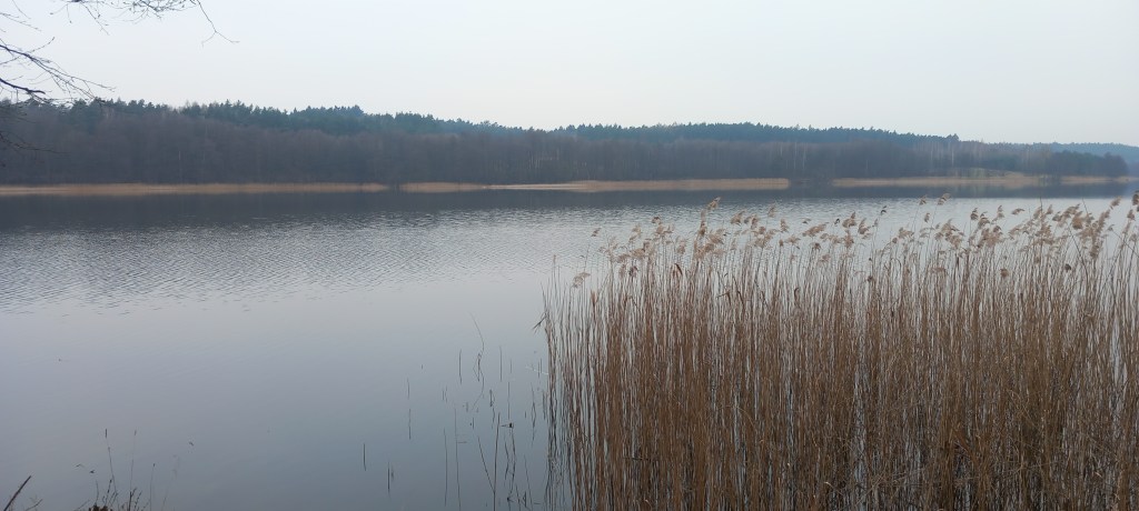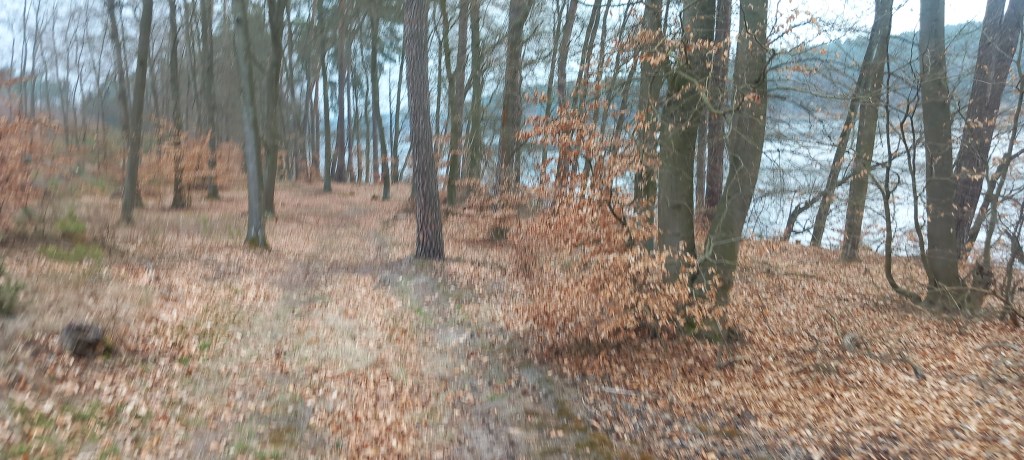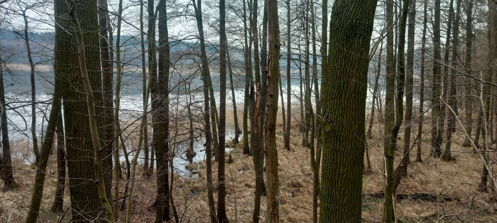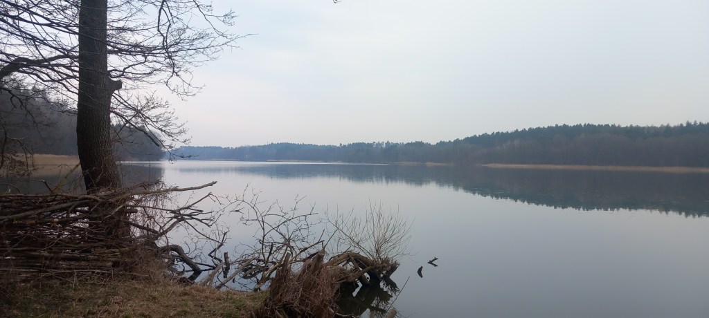 A wspomniany deszcz zaczął padać dosłownie po 5 minutach. Dobrze że tylko przelotnie, ale skutecznie obniżył morale. Na szczęście po kolejnym kwadransie przestało. Zatem wędrujemy dalej brzegiem jeziora w kierunku północnym. Po chwili znowu mamy zagwozdkę, bo ścieżka prowadzi w dół nad jeziorem, jednak po chwili się urywa. Trzeba zatem znowu zmienić wysokość (teraz wspinamy się około 50 metrów) do grodziska. Za nim mamy kolejne zejście nad jezioro (tak mądrze prowadzi ścieżka). Od tego momentu jest względnie płasko, trasa przebiega znowu przy wodzie. Jednak po kilometrze jezioro się kończy, widzimy jedynie podmokłe tereny z zaroślami. Leśną ścieżką idziemy do skrzyżowania z drogą na Lisa Młyn – Żmijewo. Znamy to miejsce z wycieczki do Brzozia (https://maronwedruje.com/2023/07/24/wokol-komina-2-do-brzozia/). My jednak dalej niestrudzenie wędrujemy na północ.