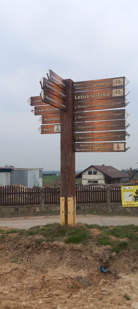 Od tego momentu maszerujemy prosto na zachód „jak w mordę strzelił”. Trochę lasu, trochę pola, trochę zabudowań (tym razem należących do wsi Tomki) i docieramy do skrzyżowania. Wybieramy opcję w lewo, zaraz za rozstajem stoi stary ceglany budynek, prawdopodobnie jest to dawna szkoła. Jeszcze kilometr i na kolejnym skrzyżowaniu skręcamy w prawo. To już Konojady, czyli nasz cel. Znamy tę wieś z wycieczki do Jamielnika (https://maronwedruje.com/2023/07/28/wokol-komina-4-do-jamielnika/). Ostatnie dwa kilometry pokonujemy chodnikiem przy drodze wzdłuż toru kolejowego linii 208. Za ostatnim już dzisiaj skrzyżowaniem z kapliczką widzimy nasz punkt docelowy, czyli dawną stację kolejową, a obecnie przystanek Konojady.