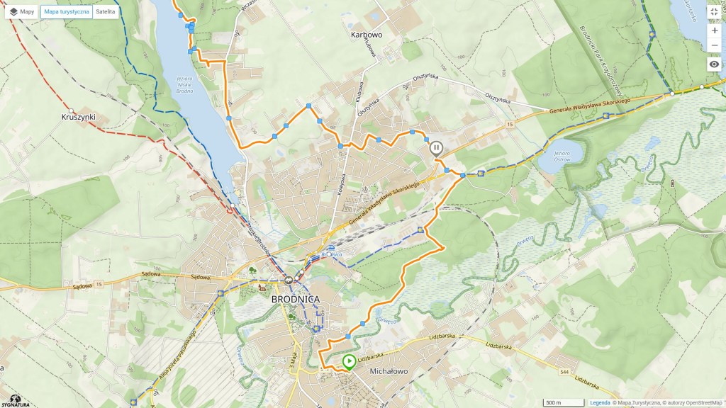 Idąc dalej mijamy dwa małe okrągłe jeziorka, to jest Portek i Czopek, czy tam Czortek i Popek. Znajduje się tam wspomniany Foluszek, który jest repliką średniowiecznego grodu. Można tam przeżyć prawdziwą lekcję historii. Docieramy do niebieskiego szlaku, którym szliśmy na jedną z pierwszych wycieczek na tym blogu (https://maronwedruje.com/2023/07/16/szlak-niebieski-ostrowite-kolo-jablonowa-brodnica/). Rzec można, że ta trasa jest niejako odwrotnością tamtej, bo wszystkie jeziora mijamy przeciwległym brzegiem. Do Ostrowitego, a właściwie z wędrowaliśmy zachodnią stroną Niskiego i Wysokiego Brodna, z kolei teraz wschodnią. W tym miejscu koło następnego akwenu, czyli Jeziora Łąki (które nie wiedzieć czemu niektórzy nazywają Najmówko) trasy obu wycieczek chwilę się pokrywają. Dokładnie to przez 800 metrów (juhu!!! szaleństwo). Po tych metrach szlak niebieski idzie dalej prosto, a my skręcamy w lewo do mostku nad rzeczką, która łączy te wszystkie jeziora. U nas mówi się na nią Struga Brodnicka, a tu na mapach widnieje jako Brodniczka.