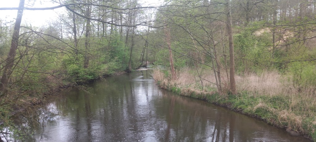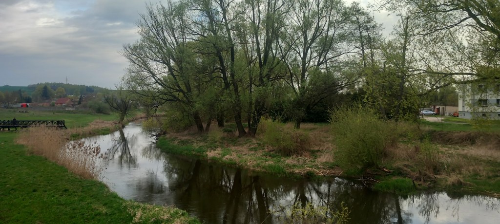 Jak już wyżej wspomniałem, z Leśnej skręcamy w prawo, dalej za zabudowaniami przypominającymi tartak wybieramy szutrową ścieżkę w lewo, która prowadzi bezpośrednio do estakady. Za nią po lewej stronie dostrzeżemy rzekę Wel. Jednak póki co jej nie przekraczamy. Nastąpi to dopiero kiedy pojawią się zabudowania i zacznie się asfalt. Owe osiedle według mapy nosi wdzięczną nazwę Młyn na Kaczku (obok znajduje się również właściwa wieś Kaczek).