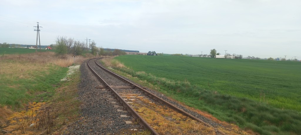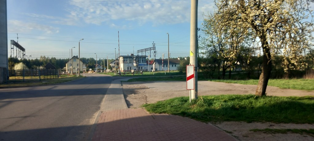 Próbowałem po drodze natknąć się na jakieś ślady dawnych stacji i innych budowli, ale minęło tyle lat, że nic już nie widać. Może lokalsi wiedzą gdzie szukać, ale ja oprócz kilku ziomeczków na ciągnikach nikogo nie spotkałem. Dopiero pod samym Samborowem przejeżdżało kilku rowerzystów, a tak to bieda. We wsi szlak prowadzi dalej prosto do głównej ulicy Ostródzkiej i do dworca kolejowego, ja jednak skróciłem sobie drogę Szkolną i przez kładkę koło Dino również do dworca. Tuż przed nim dochodzi żółty szlak, którym w zeszłym roku przyszliśmy z Iławy (https://maronwedruje.com/2024/05/19/szlak-zolty-czesc-1-ilawa-lubajny/).