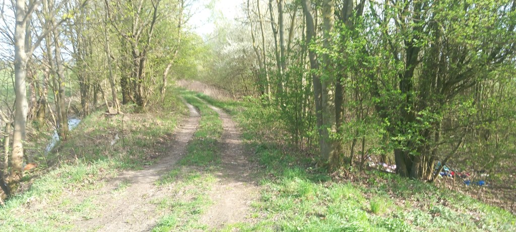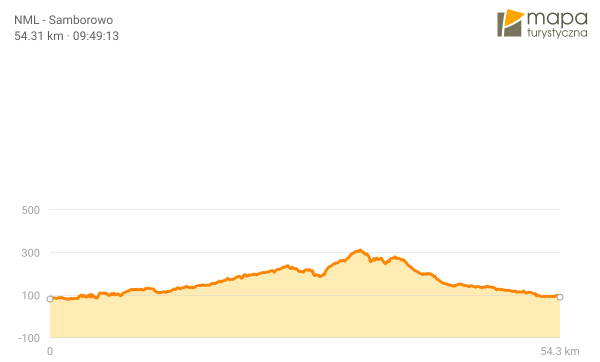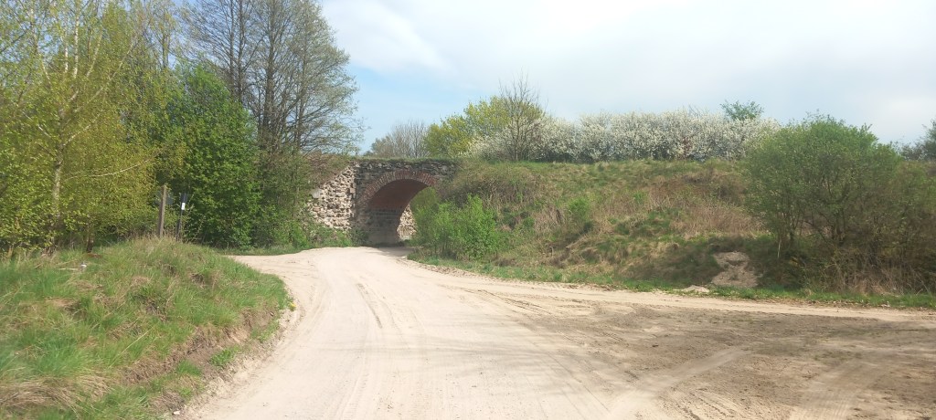 Także nad jeziorem dołącza do nas szlak niebieski, który będzie nam towarzyszył już nam do końca. Ogólnie rzecz biorąc schodzimy z górki aż do wysokości około 100 m.n.p.m. Docieramy do Pietrzwałdu i niestety zaczyna się asfalt (znowu, ehhhh). Za Pietrzwałdem jest Napromek, a za nim krzyżujemy się z drogą krajową nr 15. Jednak wędrujemy nią tylko chwilę, po 200 metrach skręcamy w prawo. Od tego momentu szlak prowadzi starotorzem wspomnianej już wcześniej linii z Turzy Wielkiej do Samborowa. W początkowej fazie napotykamy niestety na liczne przeszkody, jak na przykład krzaki, drzewa i inne zarośla. Widać, że nikt nie dba o swobodny przebieg szlaku. Dopiero mniej więcej w połowie, w okolicy wsi Gruda dochodzi do nas ścieżka rowerowa, także od tego momentu mamy trasę like a boss.