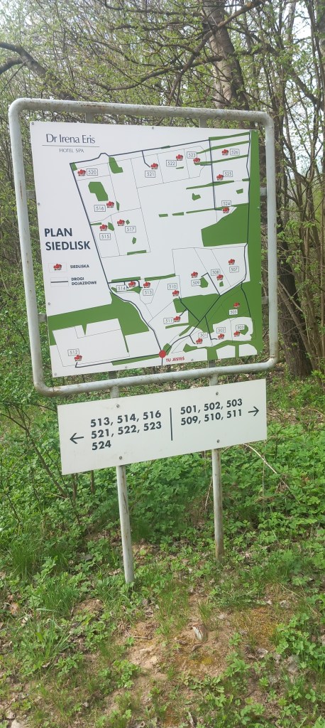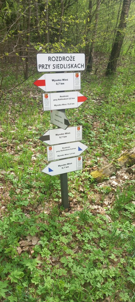 Wędrując dalej napotykamy na czerwony i czarny szlak (ale inny niż przedtem). Nawet znajdują się tam drogowskazy dla pieszych. My wybieramy czerwień i kierunek na Wysoką Wieś. Wreszcie pierwszy raz czujemy namiastkę prawdziwych „gór”, bo wyraźnie się wspinamy. Po drodze po lewej stronie jest kilka luksusowych domków, zwanych tutaj siedliskami. Nawet prowadzą do nich drogowskazy o konkretnym numerze. Okazało się, że są to ośrodki wypoczynkowe Spa Wellness Pani Ireny Eris czy jakoś tak. Nie wiem, nie znam się na mitologii greckiej.