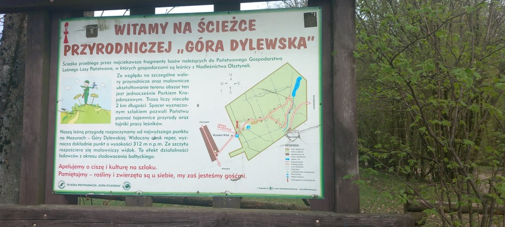Owa Polna na początku tylko z nazwy jest polna, bo towarzyszą nam zabudowania. Dopiero po pół kilometrze i skręcie w lewo zaczynają się faktyczne pola. Z resztą nazwy sąsiednich ulic są adekwatne: Rolna i Zbożowa. Plusem tego jest fakt, że kończy się asfalt i wchodzimy na szuter. Po około 2 kilometrach mamy kilka domków, na mapie oznaczonych jako Fiugajki. Dalej podchodzimy delikatnie pod górkę i trochę bardziej stromo z górki. Kolejną miejscowością na trasie jet Omule. My jednak je omijamy, przed wsią skręcamy w lewo według drogowskazów na Napromek. Niestety, wiadomo, że jak są drogowskazy, to musi być też asfalt. W Napromku krzyżujemy się po raz kolejny z drogą wojewódzką nr 537. Ściślej mówiąc docieramy do niej i cofamy się nią około 200 metrów, po czym skręcamy w prawo. Po drugiej stronie szosy mamy czerwone znaki „Park Krajobrazowy Wzgórz Dylewskich”. Czyli nasz cel jest blisko.