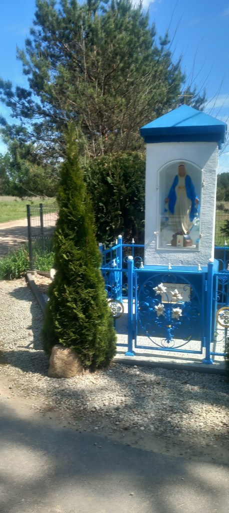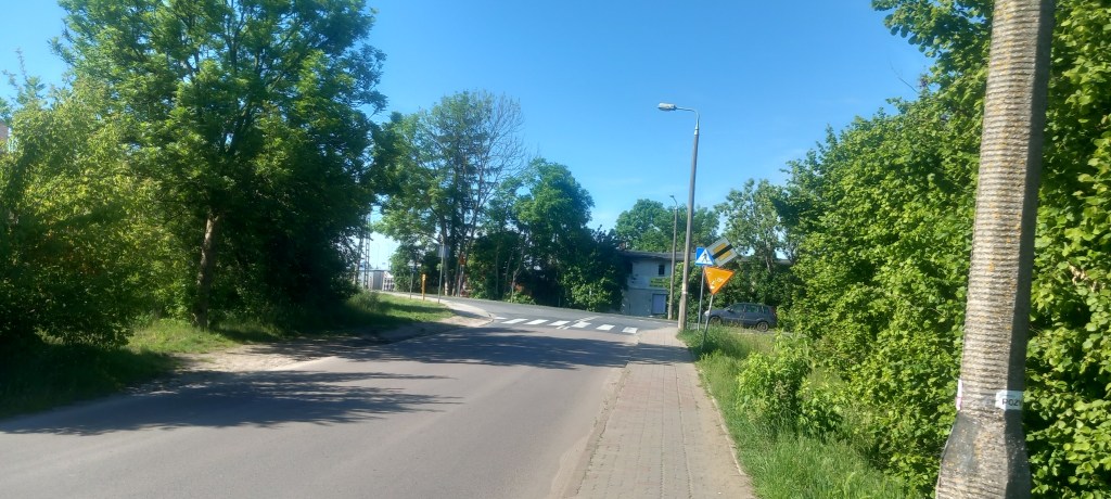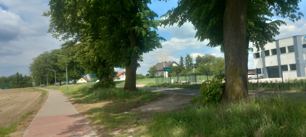 Przed właściwymi Kominami mijamy kapliczkę z krzyżem, potem domek wyglądający na schronisko dla bezdomnych, ewentualnie osiedle dla wyrzutków i marginesu (coś w stylu naszej Kałaski). Później na skrzyżowaniu prosto mamy ulicę Jastrzębią, która na terenie Brodnicy zamienia się w Długą, a my idziemy w lewo w jedyną chyba w okolicy drogę bez nazwy. Można powiedzieć, że mamy do czynienia z „Osiedlem Ptasim”, bo oprócz Jastrzębiej są tu również: Sokola, Skowronkowa, Jaskółcza, Pliszki, Orla, Słowikowa i kilka innych. Brakuje tylko Ziębowej 😀