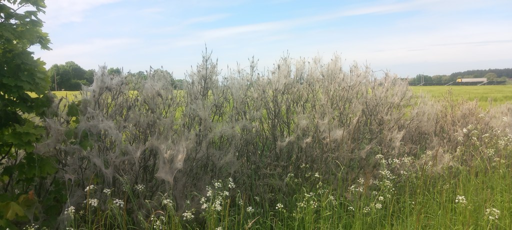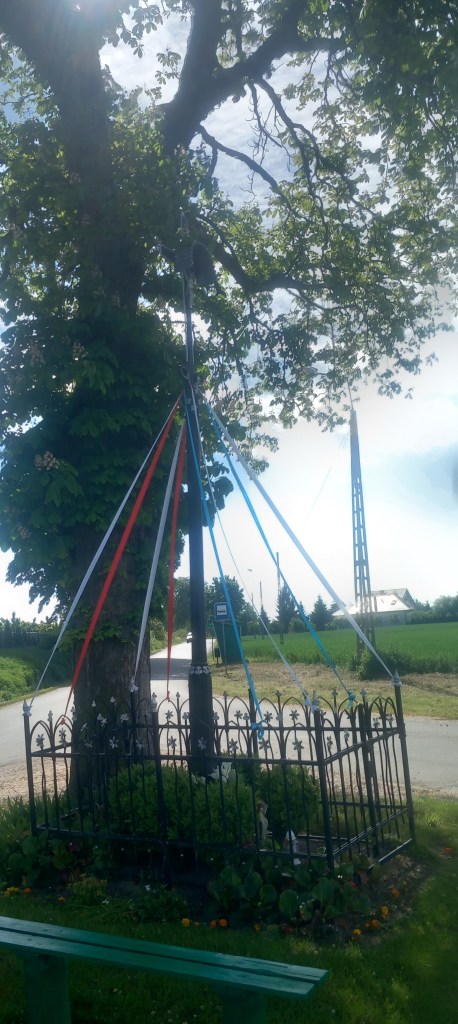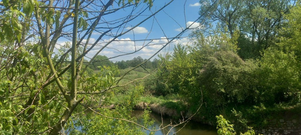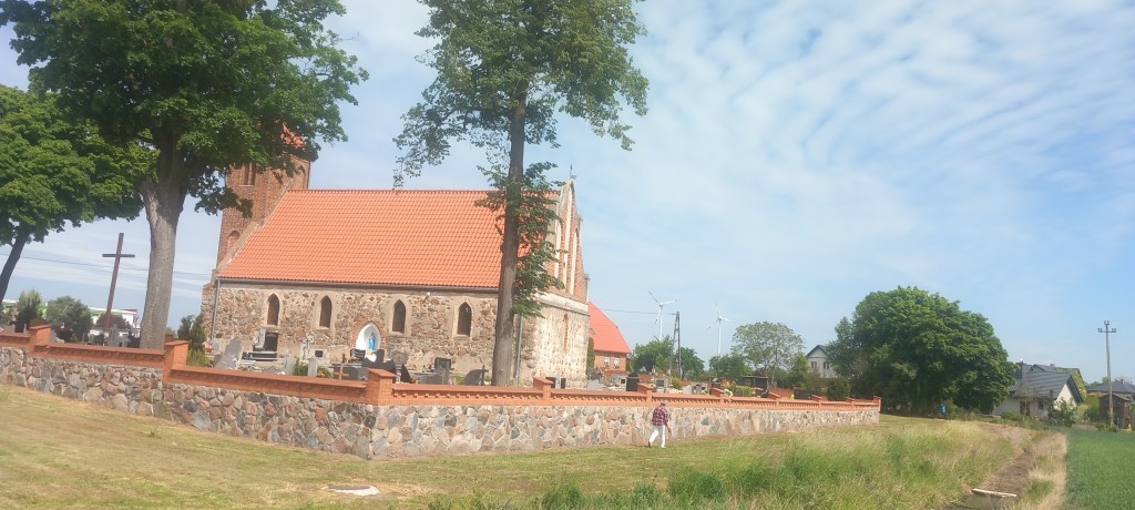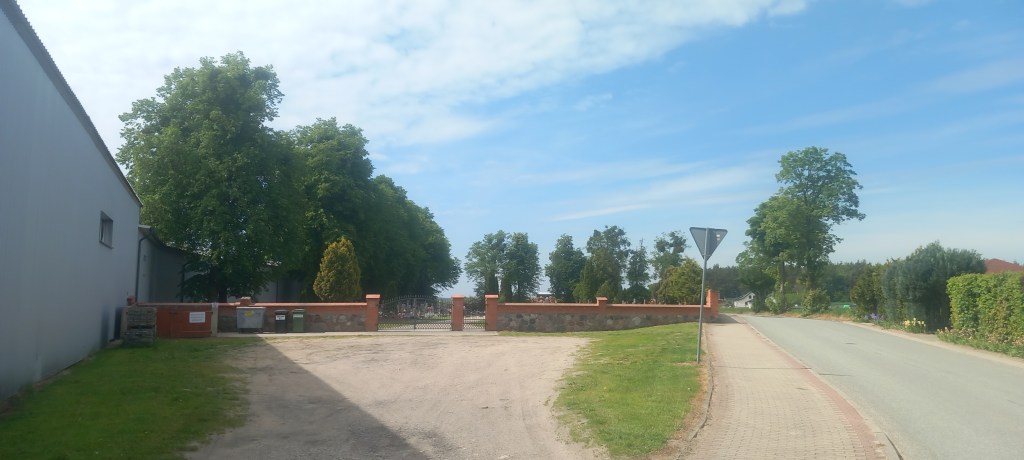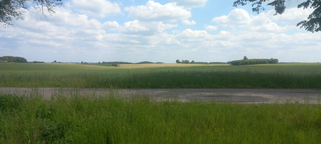 No ale, po chwili smutnej refleksji wracamy na drogę. Możemy cofnąć się tą samą trasą do Targowej, gdzie nadłożymy sporo metrów, albo zaraz na skraju lasu przedrzeć się przez bagniste tereny. Zgadnijcie którą opcję wybrałem 😀 (Na marginesie pragnę dodać, że na końcu wpisu będą zamieszczone wszystkie mapki z moimi eskapadami przez bezdroża z tej wycieczki, więc spokojnie). Zatem idziemy dalej Targową, po prawej mamy strome piaszczyste zbocza Doliny Drwęcy, mijamy skrzyżowanie z ulicą Na Belfort i wędrujemy dalej prosto pod górkę. Po jakimś czasie „Wchodzimy na wyniosłość wzgórza i oczom naszym ukazuje się las… krzyży”. A nie, wróć, to nie ten film. Rzeczywiście mamy do czynienia ze wzgórzem, ale na jego szczycie mamy jedynie „Pole, pole, łyse pole”. To znaczy kiedy tam przechodziłem, to było łyse, teraz może być inaczej. No i niestety od samej obwodnicy towarzyszy nam nasz ulubiony asfalt. Po jeszcze kilkunastu minutach docieramy do Mszana, gdzie już kilkakrotnie gościliśmy (https://maronwedruje.com/2023/07/23/szlak-zolty-czesc-3-golub-brodnica/ oraz https://maronwedruje.com/2024/03/30/wokol-komina-7-starotorzem-do-chojna/). Przy dużej kwadratowej tabliczce na przeciwko cmentarza skręcamy w prawo w kierunku Szabdy właściwej. Bo to co było na dole, to taki jakby przysiółek.
