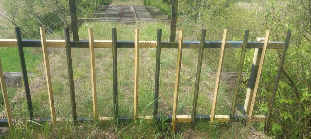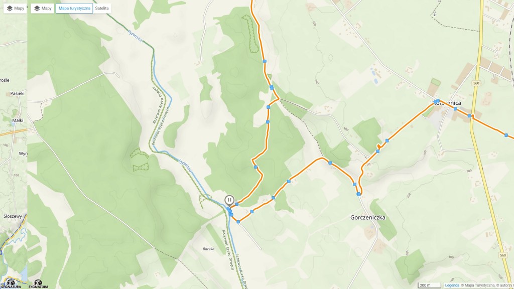 Po lewej stronę mijamy restaurację, po prawej nieco zadrzewiony kościół pw. Podwyższenia Krzyża Świętego i za zakładem produkującym palety przy cmentarzu skręcamy w lewo w kierunku Gorczeniczki. Jednak tej wsi nie zaliczamy, droga do niej skręca w lewo, a my schodzimy w prawo stromą szutrową ścieżką. Po drodze mijamy sporo zrujnowanych domków. Na kolejnym skrzyżowaniu znowu skręcamy, tym razem w lewo. Idziemy jeszcze tą drogą mniej więcej kilometr, gdzie droga skręca w lewo, a my wchodzimy na bezdroża w prawo. Po chwili przed nami dostrzegamy wysoki na około 10 metrów zrujnowany most. Musimy podejść przez trawę około 200 metrów i jak się okazuje, jest to most naszej wąskotorówki na Rypienicy. Czyli po prostu dawna granica zaborów. Dziś most jest zrujnowany i zamknięty ze znakami zakazu wstępu, tym niemniej na upartego da radę po nim przejść. Ja jednak nie jestem na tyle hardcorem, zadowoliłem się chwilą odpoczynku na górze i podziwiałem widoczki.