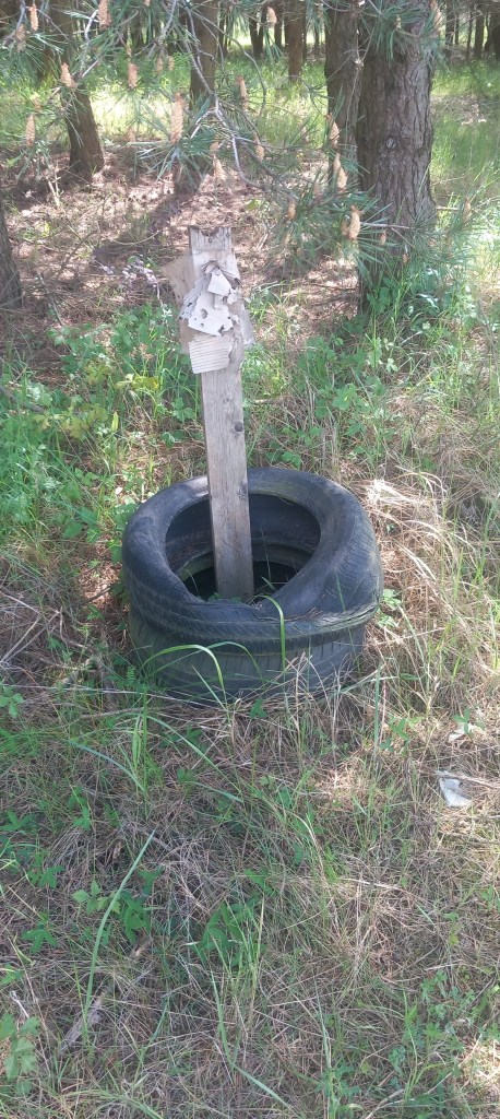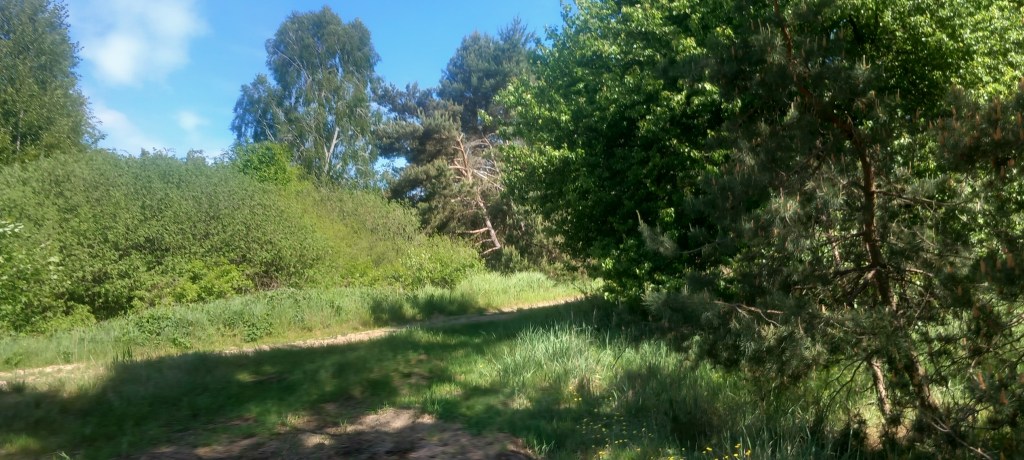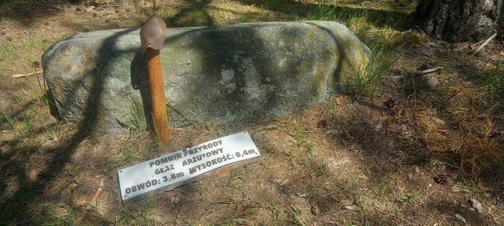 Wędrujemy nienazwaną ulicą na zachód, mijamy ochotniczą straż pożarną i docieramy do przedłużenia ulicy Ustronie. Wcześniej jednak po prawej stronie znajduje się jezioro na Wapnach. Jednak należy ono do poligonu wojskowego, więc nie wchodziłem głębiej. Skręcamy w Ustronie i znowu wędrujemy chwilkę wzdłuż starotorza. Na wysokości skrzyżowania ze Słowikową po raz drugi dzisiaj zaczynamy wędrówkę przez bezdroża, czy mówiąc potocznie wertepy, manowce albo zadupie. Skręcamy w lewo, potem w prawo i docieramy do pozornie zwykłego kamyczka, No dobra, niech będzie że głazu narzutowego, abo eratyka. Znamy już te słowo z wycieczki na Dylewską Górę (https://maronwedruje.com/2025/04/27/szlak-czarny-czerwony-niebieski-z-nowego-miasta-lubawskiego-przez-wzgorza-dylewskie-i-sladami-przedwojennej-linii-kolejowej-do-samborowa/). Oczywiście ten tutaj jest znacznie mniejszy od tamtych, gdyby był większy, to bym już dawno tam dotarł i go Wam opisał 😀