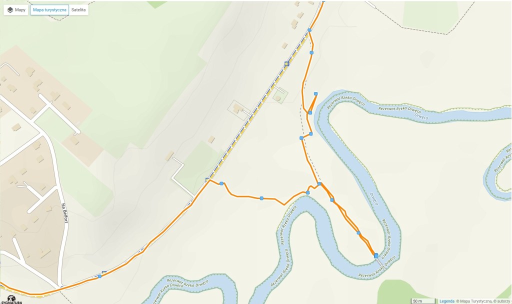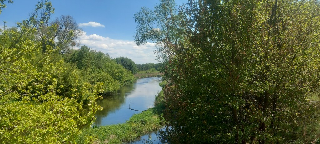 No ale wracamy do rzeczywistości, to znaczy do Ustronia. Wędrujemy dalej w stronę miasta, aż do obwodnicy. Po drodze mijamy wysypisko, oczyszczalnię ścieków oraz schronisko dla zwierząt. Na skrzyżowaniu skręcamy w lewo i prze most na Drwęcy docieramy do wspomnianego już we wstępie skrzyżowania z ulicą Targową. Tam natrafiamy na żółty szlak, któremu jak to często bywa towarzyszy „muszelka”. Więc my również do nich dołączamy. Maszerujemy teraz na południe, po około 500 metrach docieramy do miejsca, gdzie kiedyś znajdowała się stacja wąskotorówki Szabda. Dziś domek ten ma adres Targowa 3. Trochę rzeczywiście przypomina znane nam budynki kolejowe, ale tylko kształtem, bo powinien być zbudowany z czerwonej cegły, a ten jest otynkowany. Idziemy jeszcze chwilę Targową, jednak po kolejnych kilkuset metrach dostrzegamy, że ślady nasypu skręcają ostro w lewo. Zatem my również to czynimy. Zaczynamy już trzecią dziś wędrówkę przez zarośla. Początkowo wśród wyższych traw, jednak pod koniec zaczynają się gęste krzaki i drzewa. Po obu stronach widzimy rzekę, to oczywiście znowu nasza kochana Drwęca. Czyli znajdujemy się na półwyspie. Na jego końcu osiągamy wreszcie nasz cel czyli kolejny wąskotorowy most. Podobnie jak w przypadku Gorczenicy, ten również jest zamknięty, ale oczywiście dla chcącego nic trudnego. Sam pamiętam z dzieciństwa, że przechodziłem nim na drugi brzeg „na legalu”. No ale przez te lata obiekt został pozostawiony sam sobie, nie dba o niego ani kolej, ani miasto, założę się, że pewnie nawet do końca nie ustalono do kogo on należy. Ale tak to bywa niestety w naszym pięknym kraju.