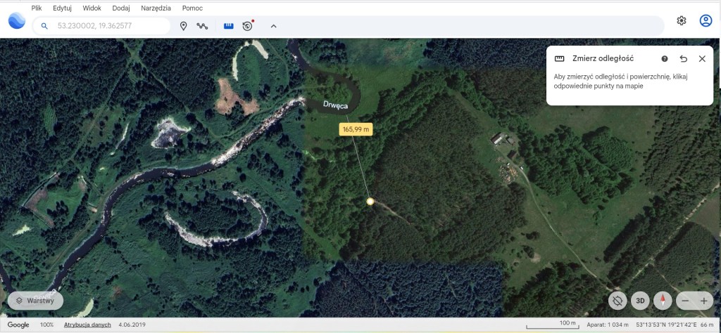 Jak już jednak wspomniałem, tylko z pozoru jest on zwykły. O jego szczególnych walorach historycznych (a może turystycznych) świadczy umieszczona przed nim na ziemi tabliczka „pomnik przyrody” wraz z podanymi wymiarami. A z drugiej strony jest to, co nas najbardziej interesuje. Mianowice chodzi o napis „1740 Ztąd prosto do Drwęcy” (pisownia oryginalna) plus kilka dodatkowych znaków po spodem, nie wiadomo czy to jakieś symbole przyrodnicze czy hieroglify, czy inna gwara. Nie wiadomo też co oznacza ta liczba. Najbardziej oczywista z teorii mówi, że to po prostu odległość do rzeki. Jednak postanowiłem sprawdzić tę wersję i na stronie Google Earth zmierzyłem tę prostą. Wychodzi 166 metrów, to raczej nie pasuje. Chyba że chodzi o inną jednostkę miary, wtedy musiało być to coś mniej więcej dziesięciocentymetrowe. Przeszukując dalej czeluści bezkresnego Internetu natrafiłem na stronę ze staropolskimi miarami odległości, jednak żadna nie pasuje do tej wartości. Na dowód moich pomiarów załączam screena 😀