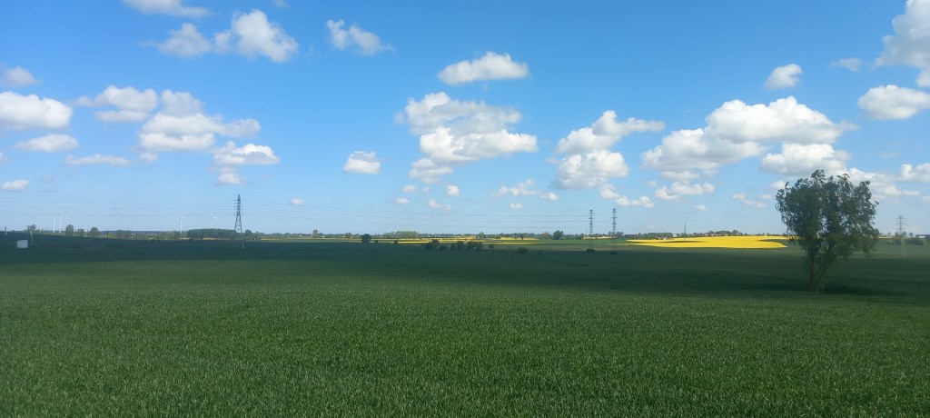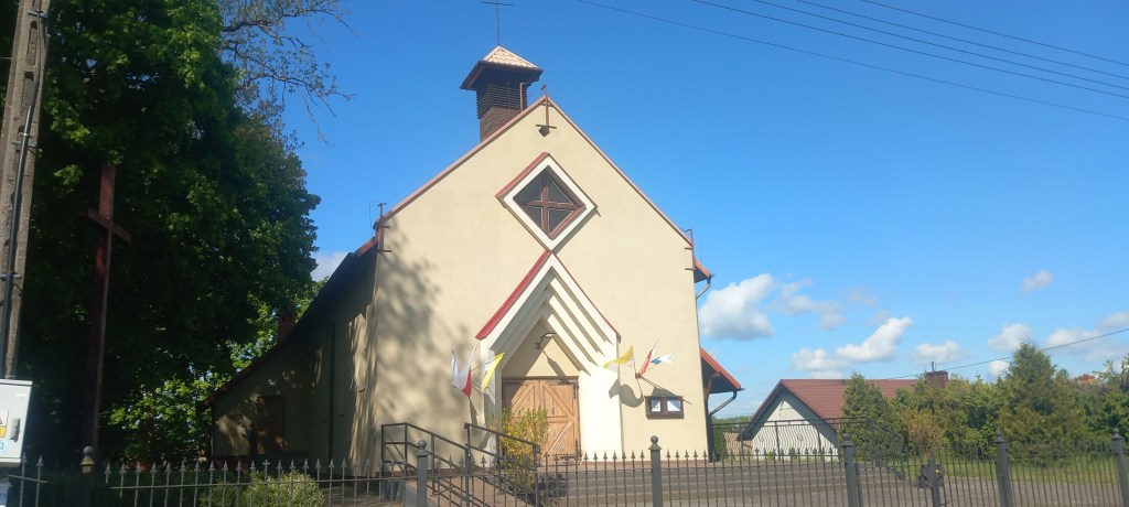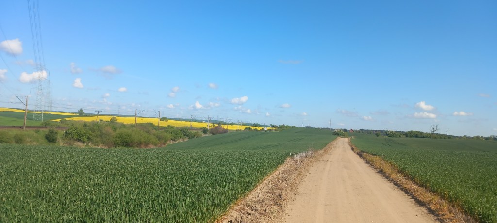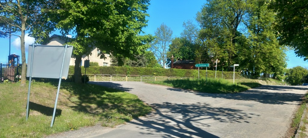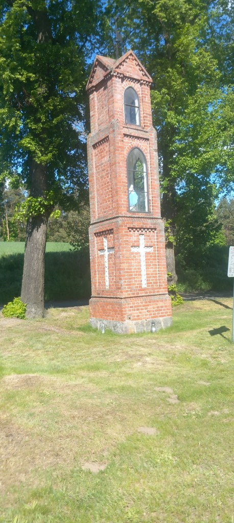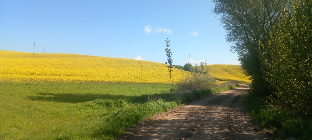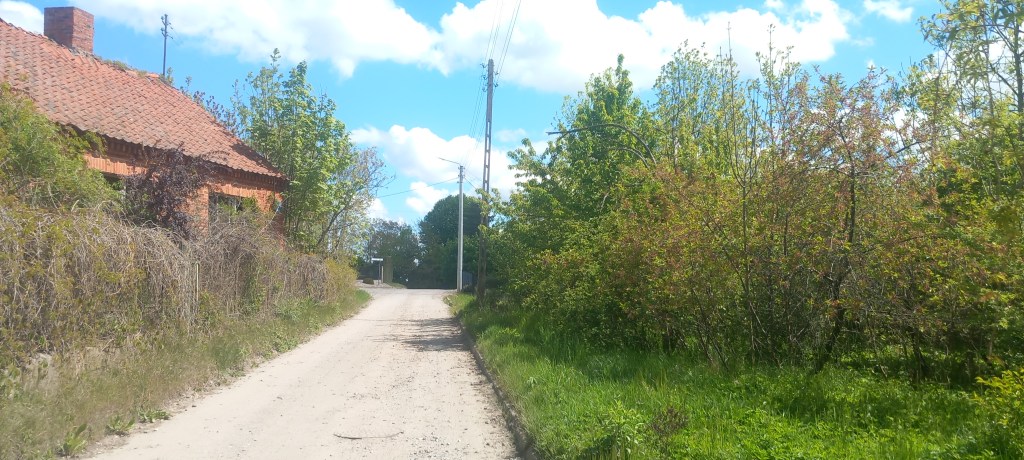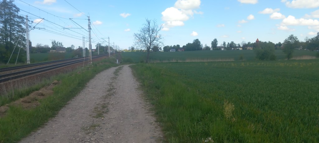W tym miejscu ciężko się zgubić, ponieważ droga nie posiada żadnych odnóg. Przechodzimy nią przez tor i zaczynamy lekkie podejście. Wychodzimy z lasu na pola i taką drogą docieramy do wsi Gętomie. Znajduje się tam malowniczo położone jeziorko i kilka kapliczek. A konkretnie dwie. Przez jakiś czas towarzyszy na asfalt, ale to tylko na chwilkę. Główna droga prowadzi dalej prosto na zachód do Nowej Cerkwi, my jednak wybieramy odnogę na północ do Kulic. Znajduje się tam przystanek Kulice Tczewskie, my jednak wędrujemy w odległości około kilometra od niego. No i znowu mamy asfalt, tym razem na około 5 km….