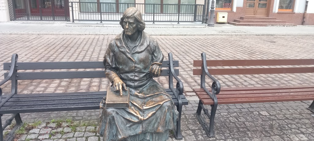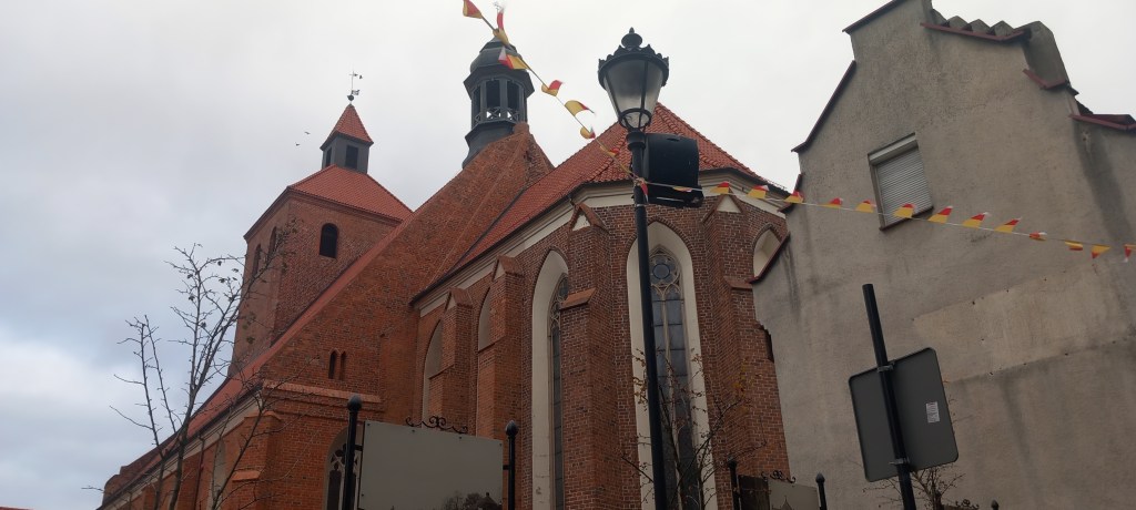 Szlak konkretnie zaczyna się w północno-zachodnim narożniku Rynku. Jest tam nawet ławka z Kopernikiem (który, nawiasem mówiąc, mi osobiście bardziej przypomina Miłościwie Nam Panującego Premiera Tuska z dłuższymi włosami, ale może to tylko moje odczucie) oraz drogowskaz. Zatem bez zbędnego bajdurzenia wyruszamy według niego ulicą Kościelną (przy której jak sama nazwa wskazuje znajduje się kościół, a konkretnie Bazylika Kolegiacka Świętego Mikołaja Biskupa) w kierunku północnym. Na pierwszym skrzyżowaniu skręcamy w lewo w Ratuszową, którą docieramy do pomnika Ułan i Dziewczyna, za którym rozpościera się przepiękna panorama Wisły. Śmiało, można robić zdjęcia. Następnie pokonujemy kolejny zakręt, tym razem wybieramy kierunek w prawo. Teraz maszerujemy ulicą Spichrzową (tak, dobrze myślicie. Przy ulicy Spichrzowej znajdują się Spichrze. Czy jak kto woli Spichlerze). Z resztą panorama na te ceglane budynki z drugiego brzegu Wisły jest jednym z najbardziej charakterystycznych widoków oraz wizytówek tego miasta. Co tu będę dużo gadać, w zeszłym roku miałem przyjemność dochodzić do Grudziądza (nie mylić z „dochodzić w Grudziądzu”), kiedy to towarzyszył mi ten piękny widok. Jak zawsze odsyłam do wpisu: https://maronwedruje.com/2024/06/09/szlak-czarny-zielony-camino-ze-smetowa-dolina-wisly-przez-nowe-do-grudziadza/.