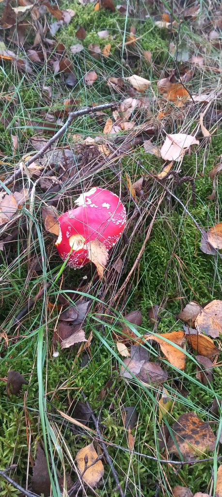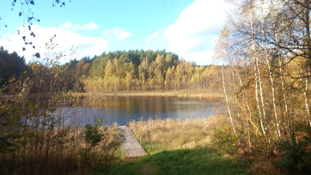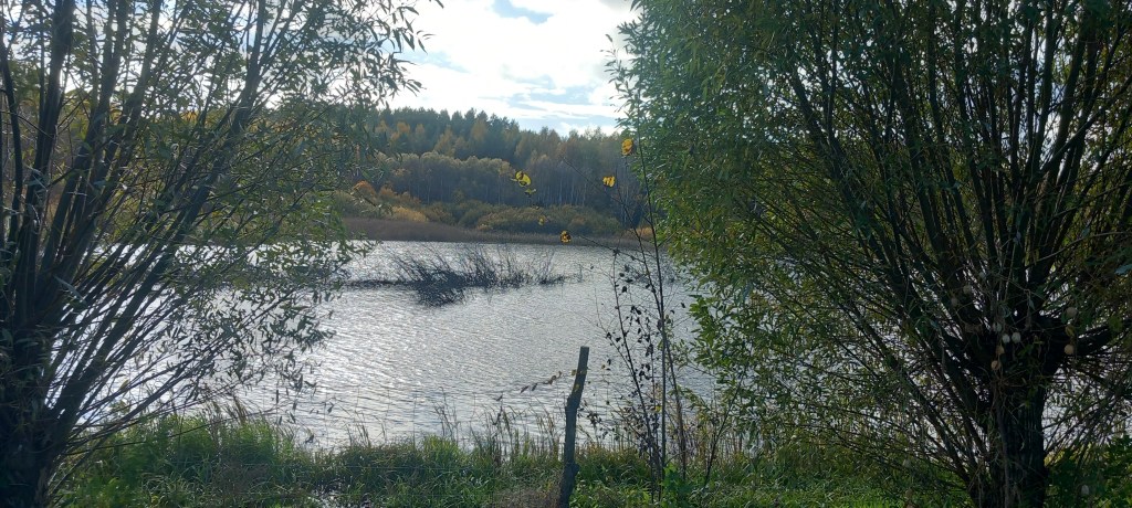 Nie wspomniałem jeszcze, że zaraz za Zakurzewem wchodzimy do lasu. Jest to o tyle istotne, że leśny krajobraz będzie nam towarzyszył przez następne prawie 30 km. Generalnie (nie lubię tego słowa, ale tu go użyję) przez kolejne 10 kilometrów nie dzieję się nic ciekawego, klasyczne leśne, zadrzewione tereny. Jako że wycieczka miała miejsce pod koniec pa/iździernika, towarzyszą nam spadające liście i piękny żółto/czerwone dywany. No i co za tym idzie, oczywiście wspaniały odgłos chrupania. Jako że jesień, to napotykamy też sporo Przysmaków Teściowej. Szlak prowadzi najpierw na północ, potem skręca na wschód. Po wspomnianych dziesięciu kilometrach po lewej stronie natrafiamy na małe śródleśne jeziorko. Jak się okazuje, nosi ono nazwę Jezioro Głęboczek. Czyli znowu mamy zbieżność z naszymi regionami.