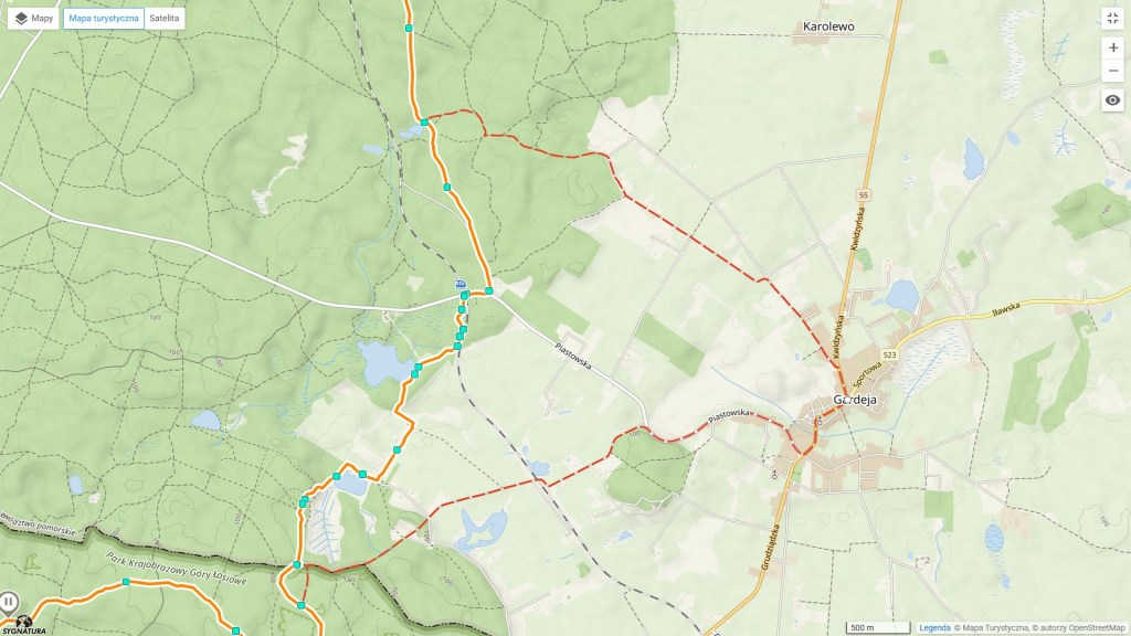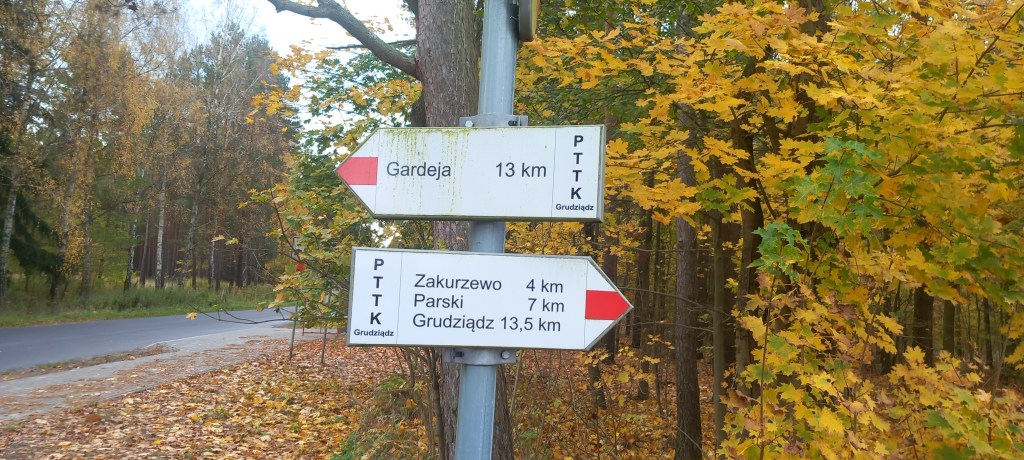 Zaraz po minięciu jeziorka nadszedł czas na trzecie już dzisiaj odejście od szlaku. Tym razem troszkę dłuższe, bo prawie pięciokilometrowe. Jednak było ono konieczne, żeby skrócić sobie drogę, bo tamtą trasą zamiast 5 km, by było 10. Czyli, jak nie trudno policzyć, dwa razy więcej. Ale na pewno w tym miejscu znajdą się maruderzy, którzy powiedzą: „Hola, hola! Skoro idziesz szlakiem, to powinieneś iść całą trasą tak jak on przebiega” Owszem, macie rację, ale jak widać na załączonej mapce, szlak przebiega przez wieś Gardeja. A tę miejscowość mam w planach na inną wycieczkę, także nie ma tego złego, co by na dobre nie wyszło.