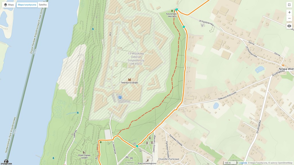 Więc ulica Spichrzowa prowadzi pod górkę, po czym zmienia nazwę na Zamkową. Chyba nie muszę mówić, że przy niej stoi zamek? Właściwie to, podobnie jak w Brodnicy głównie wieża. Warto wspomnieć, że wstęp na nią jest bezpłatny, a z góry rozpościera się wspaniała panorama na miasto i rzekę. Niestety, ja byłem tam zbyt wcześnie i jeszcze było zamknięte. Ale ogólnie polecam. Za zamkiem cały czas droga prowadzi pod górkę, asfalt wkrótce się kończy i dalej wędrujemy ścieżką pieszo-rowerową. Po prawej stronie mijamy Centrum Szkolenia Logistyki, następnie Cytadelę oraz Twierdzę Grudziądz. Ja nie byłbym sobą, gdybym troszkę nie zszedł ze szlaku. Bo postanowiłem przejść bliżej cmentarza garnizonowego. Moje „zboczenie” jak zawsze przedstawiam na mapce. Powiem tylko, że nie jest to ostatnie tego typu odejście dzisiejszego dnia, ale to wyjdzie w praniu.