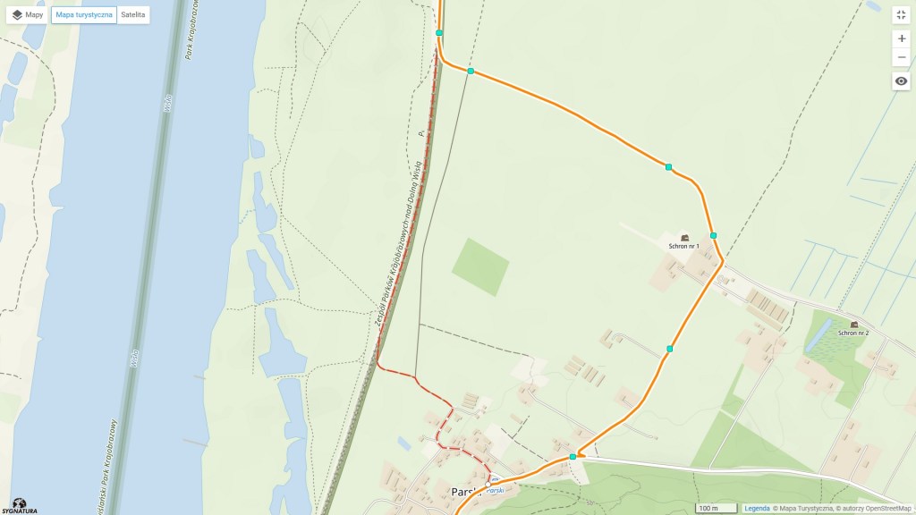 Punktem, w którym moja trasa i szlak się zeszły był pomnik przyrody w postaci kasztanowca. Dalej idziemy ulicą Forteczną, pokonujemy kilka serpentyn i ulicą Leśną pośród schronów i bunkrów przez las docieramy do pierwsze wsi na naszej trasie, czyli do Parsków (w mianowniku Parski). Tu również miało miejsce zboczenie z trasy, tym razem nieświadome. Ale wiadomo, nie będę zawracał, dlatego znalazłem alternatywną trasę. Podobnie jak w pierwszym przypadku, wszystko przedstawia mapka. Tym razem punkt zbiegnięcia znajdował się na nadwiślańskim wale przeciwpowodziowym. Tą groblą wędrujemy prawie 2 kilometry na północ (czy jak niewtajemniczeni mówią – do góry). Przed sobą widzimy dosyć strome wzgórza. Jak się okazuje, są to Góry Łosiowe. Nazwa pochodzi z faktu, że przebiega tędy korytarz migracyjny tych zwierząt. Aczkolwiek nie wiem, czy to nie ta pora roku, czy jak zawsze miałem pecha, ale jedynym łosiem, którego spotkałem, byłem ja sam. W Internetach można wyczytać, że Park Krajobrazowy Góry Łosiowe wraz z Chełmińskim Parkiem Krajobrazowym oraz Nadwiślańskim Parkiem Krajobrazowym (ponownie odsyłam do linku z wcześniejszej części tego wpisu) tworzą Zespół Parków Krajobrazowych nad Dolna Wisłą. Zatem do ogarnięcia został tylko Chełmiński. Całe życie przed nami.