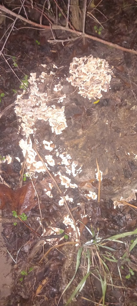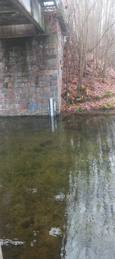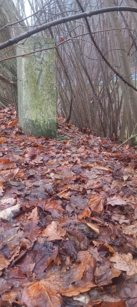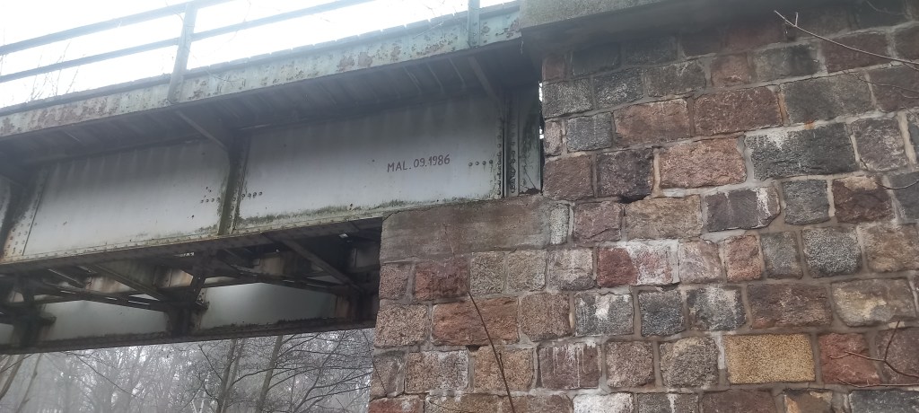 Za ośrodkiem docieramy do znanej nam drogi krajowej nr 15. I przy okazji krzyżujemy się z trasami dwóch wycieczek, w tym jednej tegorocznej (https://maronwedruje.com/2025/10/12/19-meandrujacy-pajak-kantylsko-swiecki-a-w-dalszej-czesci-zbiczenska-petla-z-mykologia-w-tle/). Z kolei drugą przeszedłem w 2024. Ale za chwilę docieramy do miejsca, które jest niejako uzupełnieniem tej trasy. Chodzi o dawną linię kolejową nr 251 (link: https://maronwedruje.com/2024/06/16/wokol-komina-12-sladem-dawnej-linii-kolejowej-nr-251-do-ilawy/) i uszkodzony most na Skarlance (ale nie na tyle uszkodzony, żeby nie można było po nim przejść). A konkretnie o to co jest pod mostem. Bo żeby to zobaczyć, trzeba zejść po stromym nasypie w stronę wody.