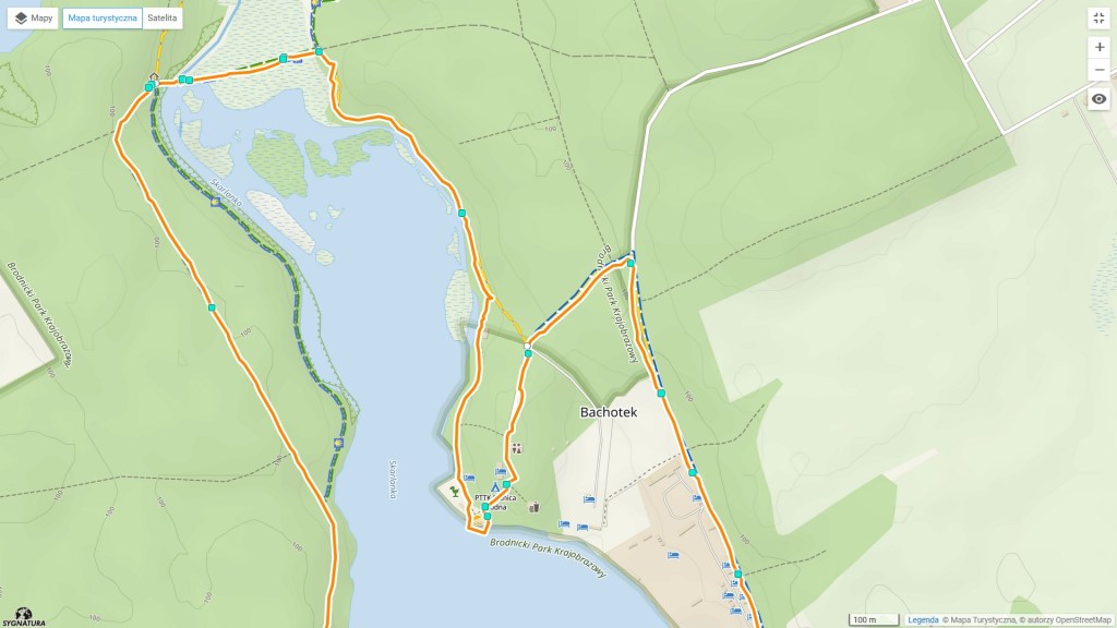 Niestety ja miałem ograniczony czas, dlatego musiałem skrócić swoją trasę. Wyszedłem z Brodnicy ulicą Kolejową, dalej Klubową przez Karbowo (chodzi mi o wieś Karbowo, a nie o dzielnicę zwaną u nas „płytą karbowską”) koło dawnego PGR-u i masarni przez Małgorzatkę do lasu. Prosta droga, ciężko się zgubić. Stamtąd już niecałe dwa kilometry i jesteśmy nad wodą. Natrafiamy na wspomnianą wyżej zieleń oraz na „muszelkę”. Wędrujemy razem do pomnika, przy którym skręcamy w prawo na Mostek Jadwigi. Łączy on dwa brzegi Skarlanki, która w tym miejscu stanowi połączenie jezior Bachotek i Strażym. Za mostkiem jeszcze chwilę wędrujemy czymś co do złudzenie przypomina groblę. Po mniej więcej trzystu metrach zielony szlak idzie prosto, a my skręcamy w prawo w żółty. Tak, to jest ten słynny długi żółty szlak z Samborowa do Torunia. Mamy go już ogarniętego w kilku etapach. Znaczy ja mam, nie wiem jak Wy 😀