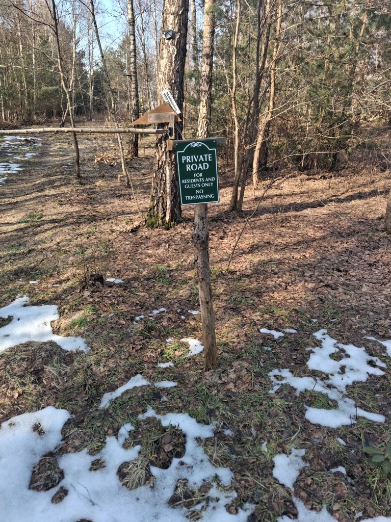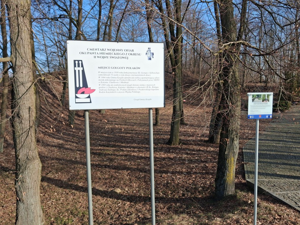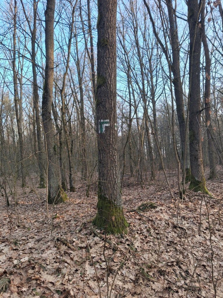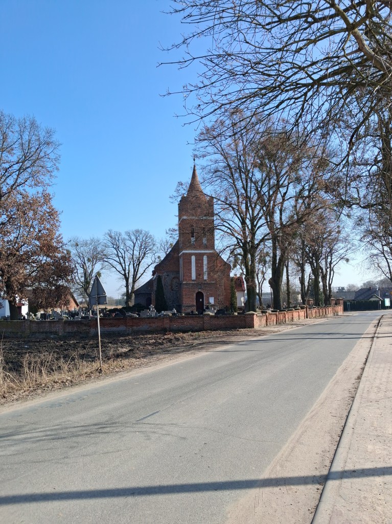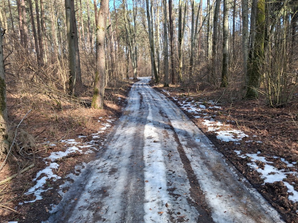 Wysiadamy na stacji i cofamy się w stronę Jabłonowa do przejazdu przez tory. Przechodzimy na drugą ich stronę ulicą Działowskiego. Prowadzą tędy drogi wojewódzkie nr 534 i 548. Ja oczywiście jestem ślepy i ponad siedemdziesiąt procent tego odcinka pokonałem poboczem, nie widząc, że po drugiej stronie jest chodnik. Mijamy tabliczkę z przekreśloną nazwą miasta, dalej sklep Dino, i wraz z towarzyszącym nam szlakiem zielonym skręcamy w trzecią ulicę w lewo. Nosi ona imię Lecha Mączyńkiego. Dalsze dwa i pół kilometra pokonujemy skrajem lasu i docieramy do miejsca, gdzie musimy się rozstać ze szlakiem. Pamiętacie ten punkt? W roku 2024 „popełniłem” wycieczkę z Kowalewa do Jabłonowa właśnie trasą o kolorze zieleni (https://maronwedruje.com/2024/05/31/szlak-zielony-3-kowalewo-jablonowo/). Wtedy postanowiłem skrócić sobie drogę i ominąć Wąbrzeźno kierując się bezpośrednio na wieś Myśliwiec. To jest właśnie to skrzyżowanie, gdzie zaczął się mój skrót. Mijamy to miejsce, idziemy dalej prosto w kierunku wsi Jaworze. Dochodzimy do skrzyżowania z główną drogą, którą wędrujemy, ale tylko chwilkę, bo zaraz skręcamy w pierwszą ścieżkę w lewo. To znaczy nie ścieżkę. Początkowo jest to droga asfaltowa, jednak z czasem przekształca się w szutrówkę. Przez podmokłe tereny (a o tej porze roku, biorąc pod uwagę ilość śniegu, który spadł zimą, wybitnie podmokłe) docieramy wreszcie do ulicy Okrężnej w Książkach. Skąd taka nazwa wsi? Czemu nie Zeszyty, albo inne Gazety czy tam Czasopisma? Szczerze mówiąc nie mam pojęcia. Jak podają czeluście Internetu, niemiecka nazwa brzmiała „Ksionsken”, więc jednak nie chodzi tu o szczególne zamiłowanie ludności do czytelnictwa. Mogę wysnuć tezę, że lokalny właściciel ziemski miał nazwisko podobnie brzmiące. Oczywiście to są tylko moje przypuszczenia i nie dałbym sobie za to ręki uciąć.