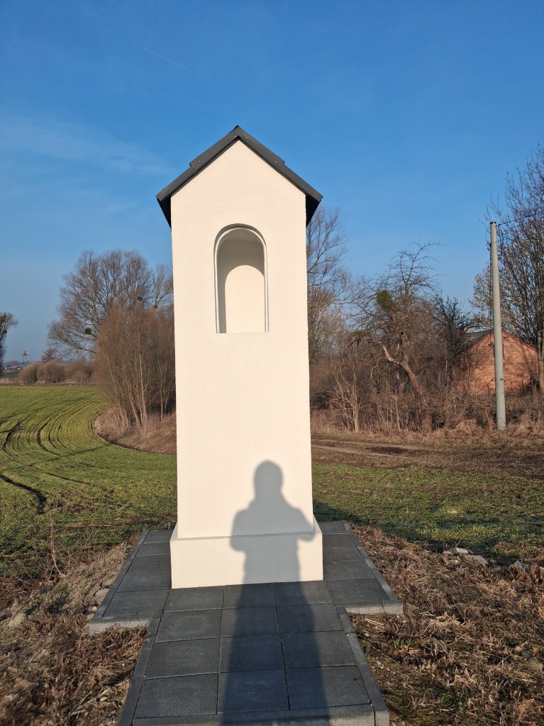 Docieramy przed front szkoły podstawowej, gdzie ponownie skręcamy, tym razem w prawo i opuszczamy wieś. Wędrujemy teraz wąwozem, przecinamy wspomnianą wyżej rzeczkę Marek i wchodzimy do lasu. Po kolejnych trzech kilometrach drzewa ustępują miejsca polom, a po prawej stronie naszym oczom ukazuje się charakterystyczny ceglany ołóweczek. To wieża neogotyckiego kościoła pw. Najświętszego Serca Pana Jezusa w Grzybnie. Po chwili docieramy do drogi wojewódzkiej nr 543, którą teraz wędrujemy, ale tylko przez niecałe 300 metrów, bo szlak ponownie skręca w przysłowiowe pole. Po kolejnych 3 kilometrach dochodzimy do linii kolejowej nr 208, którą przecinamy i za nią skręcamy w prawo, gdzie docieramy do wspomnianych już wcześniej Kruszyn Szlacheckich. I tu mamy wybór. Można dokończyć wycieczkę szlakiem czerwonym, tak jak wymienionej już tu tasie do Jabłonowa. Ja oczywiście nie byłbym sobą, gdybym poszedł tak samo, więc wybrałem ścieżkę w poprzek do Lisa Młynu. Tym odcinkiem kiedyś też już szliśmy, było to w 2023 roku podczas wyprawy do Brzozia (https://maronwedruje.com/2023/07/24/wokol-komina-2-do-brzozia/).