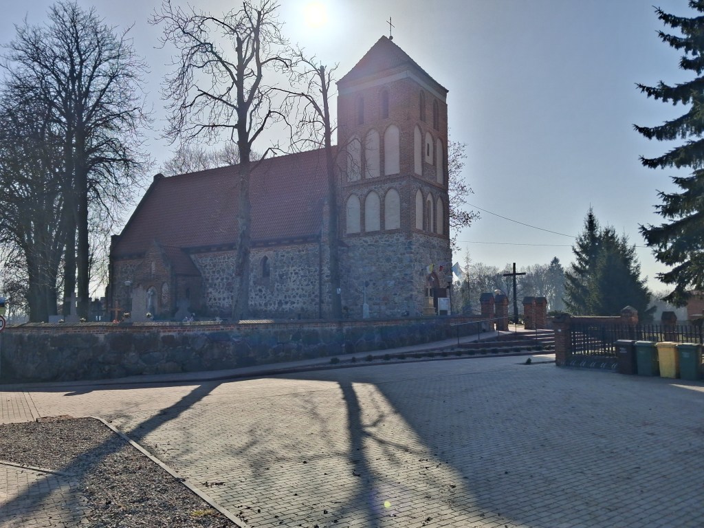 Docieramy do głównego skrzyżowania we wsi, gdzie napotykamy na tabliczkę informacyjną dotyczącą…. Muszelki. Ale zaraz! Chwila! Moment! Czekaj Pan! Skąd w Bobrowie Camino? Przecież każdy wie (a jak ktoś nie wie, to polecam nadrobić zaległości), że owy szlak wchodzi do Brodnicy od strony Tamy Brodzkiej ulicą Świerkową, dalej biegnie Dworcową przez centrum miasta, po czym wychodzi Sądową i obwodnicą w kierunku Szabdy i dalej Mszana. Więc skąd tu nagle takie zboczenie szlaku? Już tłumaczę zagadnienie. Zaraz na skrzyżowaniu stoi kościół. Jak się okazuje, jest on pod wezwaniem Św. Jakuba. A czym jest Camino? Właśnie szlakiem tego Świętego. Więc nic dziwnego, bo jest to po prostu odnoga do świątyni.