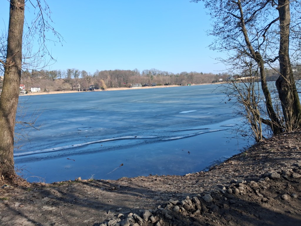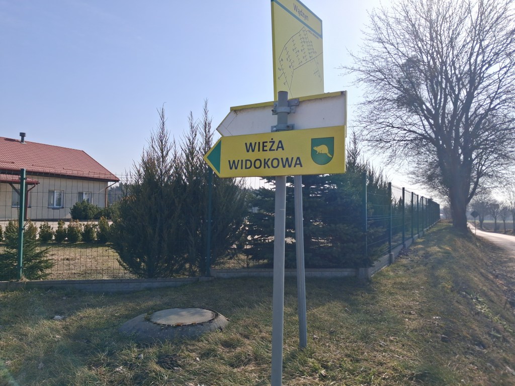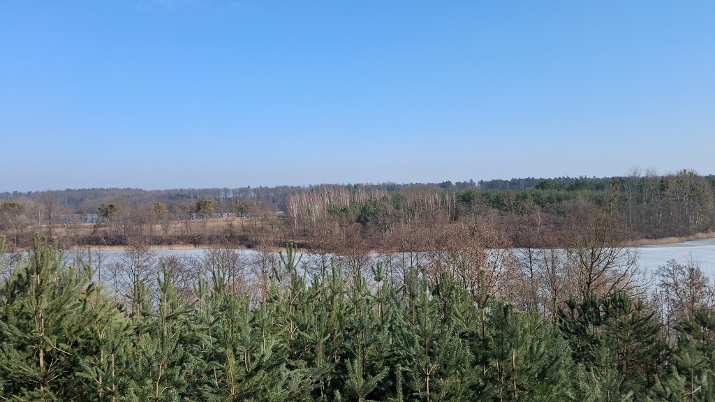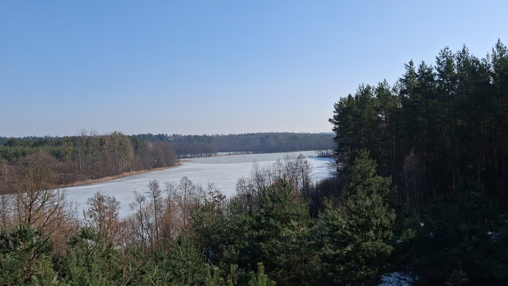 Kolejną wsią na naszej trasie są Kruszyny. I przy tej nazwie zatrzymajmy się na chwilę. Bo jest to dosyć ciekawe. Obok Kruszyn są Kruszyny – Rumunki. Chyba nie muszę tłumaczyć etymologii tej nazwy 😮 A troszkę bliżej Brodnicy, znajdują się kolejne miejscowości o podobnych nazwach. Chodzi mi o Kruszyny Szlacheckie oraz Kruszynki. Dzisiaj też będziemy tamtędy przechodzić. Ale nie uprzedzajmy faktów. Najpierw po kilku serpentynach i zawirowaniach docieramy do Wądzynia. Chodzi tu o wieś Wądzyń, która leży nad jeziorem o nazwie…. (Niesamowita sprawa. Dziwne nie?) Wądzyń. I tu wchodzimy również na czerwony szlak znany nam z jednej z pierwszych opisanych na tym blogu wycieczek z Brodnicy do Jabłonowa (https://maronwedruje.com/2023/07/15/szlak-czerwony-brodnica-jablonowo-pomorskie/). Jednak na razie szlak nas nie interesuje, mijamy drogę i idziemy dalej prosto według znaków w kierunku wieży widokowej nad brzegiem jeziora. Widoczek jak zawsze zapiera dech w piersiach. Jak już wyżej wspomniałem, temperatury w ciągu dnia sięgają około 15 stopni, jednak pokrywa lodowa w tym sezonie jest na tyle gruba, że jeszcze sporo jej zalega.